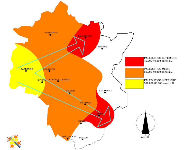 (1) Interglaciale Wurm. Si hanno i primi ritrovamenti relativi a presenze umane (manufatti tipici dell’Uomo di Neanderthal ma non fossili umani) nei siti intorno a Barberino ma soprattutto intorno a Lucignano nel territorio di S.Piero a Sieve in corrispondenza della piccola dorsale di Bosco ai Frati e del Cimitero di Galliano. Altri occasionali reperti sono stati rinvenuti nei dintorni di Borgo S.Lorenzo, Firenzuola, Ronta, Val di Sieve (Cantalupo, Bovino, Scopeti, Londa).