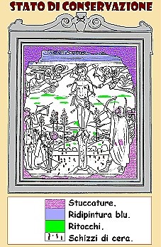Il danno più evidente era lo stato frammentario del dipinto con perdite d’intonaco pittorico tutt’intorno all’affresco, danno arrecato nel momento dell’inserimento della cornice in pietra avvenuta nel 1600. Originariamente il dipinto era delimitato da una cornice pittorica di cui rimane solo un piccolo frammento nella parte alta del dipinto e che prima del restauro era stato nascosto da una grossolana ridipintura in azzurro.