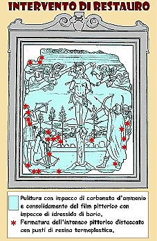 Dopo la pulitura è stato eseguito il consolidamento dell’intonaco pittorico per diffusione ad impacco di Idrossido di Bario supportato da polpa di cellulosa, operazione questa che oltre ad essere consolidante ha anche un’azione antisolfante.