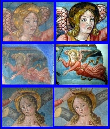 In passato, inoltre, il dipinto era stato oggetto di infiltrazioni di umidità dall’alto che avevano provocato la decoesione con conseguente polverulenza del film pittorico dei pigmenti relativi al manto dell’angelo di sinistra e l’alterazione cromatica di quello di destra.