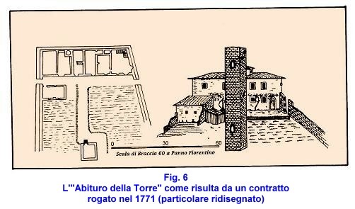 Forti di questa alleanza, i Del Palagio fecero costruire vari edifici in ordine sparso lungo la strada, ritenendo inutile qualsiasi precauzione difensiva. L’unica parziale ma preesistente fortificazione, era rappresentata dall’edificio che costituì la prima residenza della famiglia: l'”abituro della Torre” (Fig. 6). La costruzione, tuttora visibile, si trova a mezzo versante ed è costituita da una casa colonica prospiciente un’antica torre. La posizione era strategica se si pensa che da lì si può osservare un lungo tratto della via Faentina fino allo “stretto del Calderaio”.